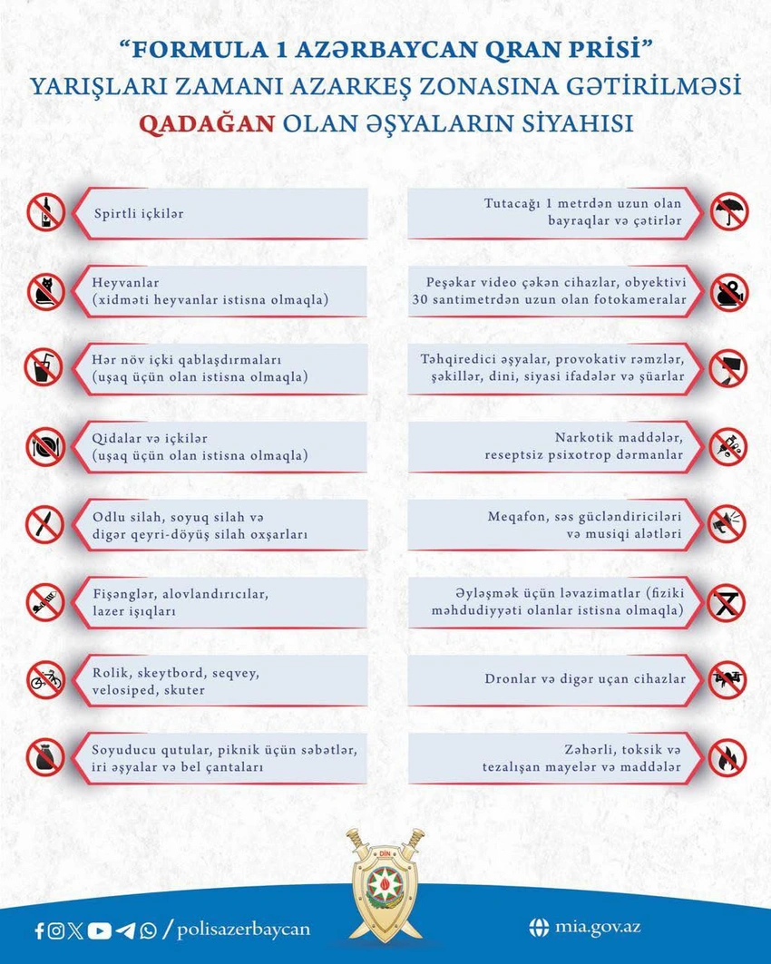 FinFly xəbər verir ki, bu gündən start götürən "Formula 1 Qatar Airways Azərbaycan Qran Prisi 2025" yarışlarının maneəsiz və təhlükəsiz şəraitdə keçirilməsi məqsədilə müəyyən əşyaların azarkeş zonasına keçirilməsi qadağandır.